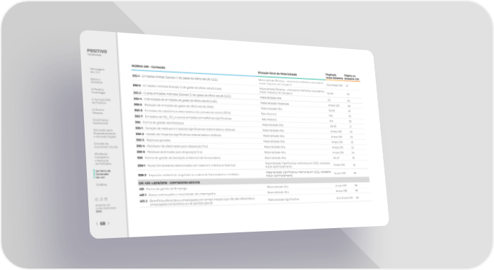 NORMA GRI - Conteúdo Situação Geral de Materialidade Página(s) Página no neste Relatório Relatório GRI Mensagem do CEO 305-1 - Emissões diretas (Escopo 1) de gases de efeito estufa (GEE) Materialidade Relativa - entretanto melhorias necessárias - 62 e Anexo GRI 47 maior impacto em escopo 3 Sobre o Materialidade Relativa - entretanto melhorias necessárias - Relatório 305-2 - Emissões indiretas (Escopo 2) de gases de efeito estufa (GEE) 62-63 48 maior impacto em escopo 4 A Positivo 305-3 - Outras emissões indiretas (Escopo 3) de gases de efeito estufa (GEE) Materialidade Alta 63 48 Tecnologia A Jornada ESG 305-4 - Intensidade de emissões de gases de efeito estufa (GEE) Materialidade Moderada Anexo GRI 48 da Positivo 305-5 - Redução de emissões de gases de efeito estufa (GEE) Materialidade Alta 62-63 50 Cultura e 305-6 - Emissões de substâncias destruidoras da camada de ozônio (SDO) Não Material NA 50 Pessoas 305-7 - Emissões de NO , SO e outras emissões atmosféricas signi昀椀cativas Não Material NA 50 X X Governança 306 - Forma de gestão dos Resíduos Materialidade Alta 58-59 51 Sustentável 306-1 - Geração de resíduos e impactos signi昀椀cativos relacionados a resíduos Materialidade Alta Anexo GRI 52 Educação para Empoderamento 306-2 - Gestão de impactos signi昀椀cativos relacionados a resíduos Materialidade Alta Anexo GRI 52 e Inclusão Digital 306-3 - Resíduos gerados Materialidade Alta Anexo GRI 53 Jornada da 306-4 - Resíduos não destinados para disposição 昀椀nal Materialidade Alta Anexo GRI 53 Economia Circular E昀椀ciência 306-5 - Resíduos destinados para disposição 昀椀nal Materialidade Alta Anexo GRI 54 Energética 308 - Forma de gestão da Avaliação ambiental de fornecedores Materialidade Alta 46-47 55 e Redução de Emissões 308-1 - Novos fornecedores selecionados com base em critérios ambientais Materialidade Signi昀椀cativa, melhorias em 2022, necessita Anexo GRI 55 maior Aprimoramento Sumário de Materialidade Signi昀椀cativa, melhorias em 2022, necessita Conteúdo 308-2 - Impactos ambientais negativos na cadeia de fornecedores e medidas Anexo GRI 55 da GRI maior Aprimoramento Créditos GRI 400 v.2016/2018 - CONTEÚDOS SOCIAIS 401 - Forma de gestão do Emprego Materialidade Alta Anexo GRI 56 401-1 - Novas contratações e rotatividade de empregados Materialidade Alta Anexo GRI 56 401-2 - Ben efícios oferecidos a empregados em tempo integral que não são oferecidos a Materialidade Signi昀椀cativa 35 e Anexo GRI 58 Relatório de empregados temporários ou de período parcial Sustentabilidade 2022 68