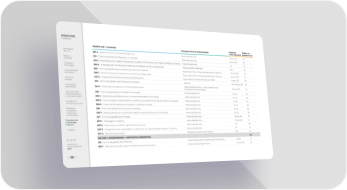 NORMA GRI - Conteúdo Situação Geral de Materialidade Página(s) Página no neste Relatório Relatório GRI Mensagem 201-4 - Apoio 昀椀nanceiro recebido do governo Materialidade Alta Anexo GRI 32 do CEO Sobre o 202 - Forma de gestão da Presença no mercado Materialidade Alta Anexo GRI 32 Relatório 202-1 - Proporção entre o salário mais baixo e o salário-mínimo local, com discriminação por gênero Materialidade Alta 32 32 A Positivo 202-2 - Proporção de membros da diretoria contratados na comunidade local Materialidade Moderada NA 33 Tecnologia 203 - Forma de gestão dos Impactos Econômicos Indiretos Reportado, Porém Materialidade Baixa / Relativa Anexo GRI 33 A Jornada ESG 203-1 - Investimentos em Infraestrutura e Serviços Suportados Reportado, Porém Materialidade Baixa / Relativa Anexo GRI 33 da Positivo Cultura e 203-2 - Impactos Econômicos Indiretos Signi昀椀cativos Não Material, Previsto Revisão até 2025 Anexo GRI 33 Pessoas 204 - Forma de gestão das Práticas de Compras Material 46 e Anexo GRI 34 Governança 204-1 - Proporção de gastos com fornecedores locais Materialidade Relativa - Setor depende de Anexo GRI 34 Sustentável componentes importados Educação para 205 - Forma de gestão do Combate à Corrupção Materialidade Alta 44-45 35 Empoderamento 205-1 - Operações avaliadas quanto a riscos relacionados à corrupção Materialidade Alta 44-45 35 e Inclusão Digital Jornada da 205-2 - Comunicação e capacitação em políticas e procedimentos de combate à corrupção Materialidade Alta 44-45 36 Economia Circular 205-3 - Casos con昀椀rmados de corrupção e medidas tomadas Materialidade Alta 44-45 36 E昀椀ciência 206 - Forma de gestão da Concorrência Desleal Materialidade Alta 44-45 36 Energética 206-1 - Ações judiciais por concorrência desleal, práticas de truste e monopólio Materialidade Alta 44-45 36 e Redução de Emissões 207 - Forma de gestão dos Tributos Materialidade Alta Anexo GRI 37 Sumário de 207-1 - Abordagem tributária Materialidade Alta Anexo GRI 37 Conteúdo da GRI 207-2 - Governança, controle e gestão de risco 昀椀scal Materialidade Alta 43 38 Créditos 207-3 - Engajamento de stakeholders e gestão de suas preocupações quanto a tributos Materialidade Alta 43 41 207-4 - Relatório país-a-país Reportado, porém Não Material NA 41 GRI 300 v. 2016/2018/2020 - CONTEÚDOS AMBIENTAIS 42 Relatório de 301 - Forma de gestão dos Materiais Materialidade Alta, necessita aprimoramento 58-59 42 Sustentabilidade 301-1 - Materiais utilizados, discriminados por peso ou volume Materialidade Signi昀椀cativa Anexo GRI 42 2022 66