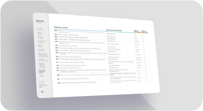 NORMA GRI - Conteúdo Situação Geral de Materialidade Página(s) Página no neste Relatório Relatório GRI Mensagem 405-2 - Proporção entre o salário-base e a remuneração recebidos pelas mulheres e aqueles rece- do CEO Materialidade Alta 33-34 69 bidos pelos homens Sobre o 406 - Forma de gestão – Não discriminação Materialidade Alta 33-34 69 Relatório A Positivo 406-1 - Casos de discriminação e medidas corretivas tomadas Materialidade Alta 33-34 69 Tecnologia 407 - Forma de gestão – Liberdade Sindical e Negociação Coletiva Materialidade Alta Anexo GRI 70 A Jornada ESG 407-1 - Operações e fornecedores em que o direito à liberdade sindical e à negociação coletiva Materialidade Moderada Anexo GRI 70 da Positivo pode estar em risco Cultura e 408 - Forma de gestão – Trabalho infantil Materialidade Alta 46-47 71 Pessoas 408-1 - Operações e fornecedores com risco signi昀椀cativo de casos de trabalho infantil Materialidade Signi昀椀cativa Anexo GRI 71 Governança 409 - Forma de gestão – Trabalho forçado ou análogo ao escravo Materialidade Alta 46-47 71 Sustentável 409-1 - Oper ações e fornecedores com risco signi昀椀cativo de casos de trabalho forçado ou análogo Materialidade Signi昀椀cativa Anexo GRI 72 Educação para ao escravo Empoderamento e Inclusão Digital 410 - Forma de gestão – Práticas de segurança Materialidade Relativa Anexo GRI 72 Jornada da 410-1 - Pessoal de segurança capacitado em política ou procedimentos de direitos humanos Materialidade Alta Anexo GRI 73 Economia Circular Materialidade Relativa à explorar em foco estratégico 411 - Forma de gestão – Direito dos povos indígenas até 2025 Anexo GRI 73 E昀椀ciência Energética 411-1 - Casos de violação de direitos de povos indígenas Materialidade Relativa Anexo GRI 73 e Redução de Emissões 413 - Forma de gestão – Comunidades locais Materialidade Alta 52-56 73 Sumário de 413-1 - Oper ações com engajamento, avaliações de impacto e programas de desenvolvimento Material, Melhorias Em 2022, Necessita 52-56 75 Conteúdo voltados à comunidade local aior Aprimoramento da GRI 413-2 - Operações com impacto negativo corrente e potencial signi昀椀cativo às comunidades locais Materialidade Moderada, foco estratégico para melhoria 52-56 75 Créditos até 2025 414 - Forma de gestão da Avaliação social de fornecedores Materialidade Signi昀椀cativa, melhorias em 2022, necessita 46-47 76 maior Aprimoramento 414-1 - Novos fornecedores selecionados com base em critérios sociais Materialidade Signi昀椀cativa, melhorias em 2022, necessita 46-47 76 Relatório de maior Aprimoramento Sustentabilidade 2022 70
