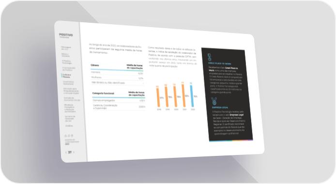 Ao longo do ano de 2022, os colaboradores da Po- Como resultado desse e de todos os esforços re- Mensagem sitivo participaram da seguinte média de horas centes, o índice de satisfação do colaborador da do CEO de treinamento: Positivo, de acordo com a pesquisa GPTW, vem Sobre o evoluindo nos últimos anos, mostrando um im- Relatório GREAT PLACE TO WORK portante avanço em 2022, tanto em termos de A Positivo Média de horas nota quanto de participação: Recebemos o Selo Great Place to Tecnologia Gênero Work como uma das melhores de capacitação A Jornada ESG empresas para se trabalhar no Paraná. da Positivo Homens 6,12h O Great Place to Work é composto por Cultura e Mulheres 5,17h 100 empresas e está dividido em três Pessoas 77 75 categorias: pequena, média e grande Governança Não Binário ou Não Identi昀椀cado - 68 70 porte. A Positivo Tecnologia está Sustentável 62 classi昀椀cada entre as 20 melhores na Educação para categoria grande porte. Empoderamento Categoria funcional Média de horas e Inclusão Digital de capacitação 85% 76% 57% 76% 78% Jornada da Economia Circular Demais empregados 4,16 h E昀椀ciência Gerência, Coordenação 21,83 h Energética e Supervisão EMPRESA LEGAL e Redução 2018 2019 2020 2021 2022 de Emissões A Positivo Tecnologia recebeu pelo Sumário de terceiro ano o selo Empresa Legal Conteúdo da Gerar - Geração de Emprego, da GRI Renda e Apoio ao Desenvolvimento Créditos Regional. O certi昀椀cado reconhece as companhias do Paraná que são exemplos no desenvolvimento da aprendizagem pro昀椀ssional. Relatório de Sustentabilidade 2022 37