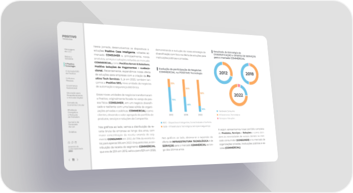 Nessa jornada, desenvolvemos os dispositivos e demonstrando a evolução da nossa estratégia de ▌ Resultado da Estratégia de soluções Positivo Casa Inteligente, voltados ao diversi昀椀cação com foco na oferta de soluções para DIVERSIFICAÇÃO e OFERTA DE SERVIÇOS Mensagem para o mercado COMMERCIAL do CEO mercado CONSUMER e, principalmente, novos instituições públicas e privadas. Sobre o produtos, serviços e soluções voltados ao mercado Relatório COMMERCIAL, como Positivo Server & Solutions, A Positivo Positivo Soluções de Pagamentos e e.educa- ▌ Evolução da participação de Negócios Tecnologia 2012 2018 cional. Recentemente, expandimos nossa oferta COMMERCIAL na POSITIVO Tecnologia A Jornada ESG da Positivo de soluções para empresas com a criação da Po- Cultura e sitivo Tech Services. E, já em 2023, também lan- Pessoas çamos a Positivo SEG, nova unidade de negócios 25% Governança de automação e segurança eletrônica. 54% Sustentável 82% Educação para Essas novas unidades de negócios transformaram 2022 Empoderamento e Inclusão Digital a Positivo, originalmente focada no varejo de pes- 75% Jornada da soa física (CONSUMER), em um negócio diversi昀椀- 46% Economia Circular cado e resiliente com uma base sólida de organi- E昀椀ciência zações privadas e públicas (COMMERCIAL) como 18% Hardware Consumo Energética e Redução clientes, elevando o valor agregado do portfólio de 2012 2018 2022 Infraestrutura Tecnológica de Emissões produtos, serviços e soluções da Companhia. Serviços e Soluções Sumário de B2C - Dispositivos Inteligentes, Conectividade e Conforto Conteúdo da GRI Nos grá昀椀cos ao lado, vemos a distribuição da re- B2B - Infraestrutura Tecnológica, Serviços e Segurança Créditos ceita bruta da empresa ao longo dos anos, com A seguir, apresentamos nosso portfólio completo maior concentração da receita oriunda do seg- de Produtos, Serviços e Soluções e como aten- mento CONSUMER em 2012, de 75% da receita to- Nos grá昀椀cos ao lado, observa-se a expansão da dem às necessidades de nossos clientes no mer- tal, para apenas 18% em 2022. Enquanto isso, a con- oferta de INFRAESTRUTURA TECNOLÓGICA e de cado consumidor (CONSUMER) e no mercado de Relatório de tribuição da receita do segmento COMMERCIAL, SERVIÇOS para o mercado COMMERCIAL ao lon- organizações privadas, instituições públicas e es- Sustentabilidade 2022 que era de 25% em 2012, saltou para 82% em 2022, go dos últimos anos. colas (COMMERCIAL). 11