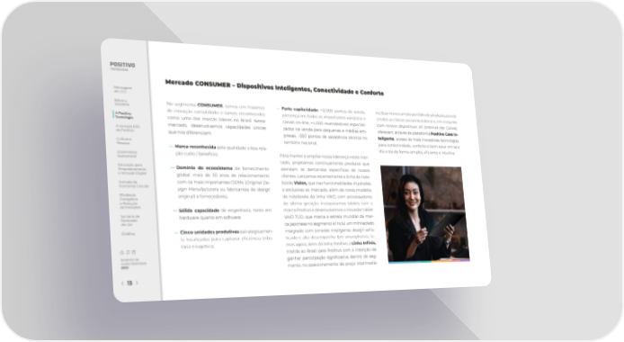 Mercado CONSUMER – Dispositivos Inteligentes, Conectividade e Conforto Mensagem do CEO Sobre o No segmento CONSUMER, temos um histórico ― Forte capilaridade: +12.000 pontos de venda, rio. Esse novo e amplo portfólio de produtos atende Relatório de inovação consolidado e somos reconhecidos presença em todos os importantes varejistas e a todas as classes sociais brasileiras e, em conjunto A Positivo como uma das marcas líderes no Brasil. Nesse canais on-line, +4.000 revendedores especiali- com nossos dispositivos IoT (Internet das Coisas), Tecnologia A Jornada ESG mercado, desenvolvemos capacidades únicas zados na venda para pequenas e médias em- oferecem, através da plataforma Positivo Casa In- da Positivo que nos diferenciam: presas, +250 pontos de assistência técnica no teligente, acesso às mais inovadoras tecnologias Cultura e território nacional. para conectividade, conforto e bem-estar em seu Pessoas ― Marca reconhecida pela qualidade e boa rela- dia a dia de forma simples, e昀椀ciente e intuitiva. Governança ção custo / benefício; Para manter e ampliar nossa liderança neste mer- Sustentável cado, projetamos continuamente produtos que Educação para ― Domínio do ecossistema de fornecimento atendam às demandas especí昀椀cas de nossos Empoderamento e Inclusão Digital global: mais de 30 anos de relacionamento clientes. Lançamos recentemente a linha de note- Original De- books Vision, que traz funcionalidades inusitadas Jornada da com os mais importantes ODMs ( Economia Circular sign Manufacturers ou fabricantes de design e exclusivas ao mercado, além de novos modelos E昀椀ciência original) e fornecedores; de notebooks da linha VAIO, com processadores Energética e Redução de última geração. Incorporamos tablets com a de Emissões ― Sólida capacidade de engenharia, tanto em marca Positivo e desenvolvemos o inovador tablet Sumário de hardware quanto em software; VAIO TL10, que marca a estreia mundial da mar- Conteúdo da GRI ca japonesa no segmento e inclui um miniteclado Créditos ― Cinco unidades produtivas estrategicamen- integrado com conexão inteligente, design so昀椀s- te localizadas para capturar e昀椀ciência tribu- ticado e alto desempenho. Em smartphones, te- tária e logística; mos agora, além da linha Positivo, a Linha In昀椀nix, trazida ao Brasil pela Positivo com a intenção de Relatório de ganhar participação signi昀椀cativa dentro do seg- Sustentabilidade 2022 mento, no posicionamento de preço intermediá- 13