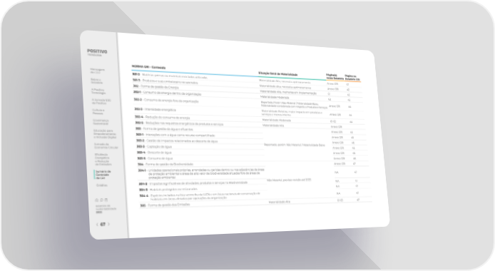 NORMA GRI - Conteúdo Situação Geral de Materialidade Página(s) Página no neste Relatório Relatório GRI Mensagem 301-2 - Matérias-primas ou materiais reciclados utilizados Materialidade Alta, necessita aprimoramento Anexo GRI 42 do CEO Sobre o 301-3 - Produtos e suas embalagens recuperados Materialidade Alta, necessita aprimoramento Anexo GRI 42 Relatório 302 - Forma de gestão da Energia Materialidade Alta, melhorias em implementação 61 43 A Positivo 302-1 - Consumo de energia dentro da organização Materialidade Moderada 62 43 Tecnologia 302-2 - Consumo de energia fora da organização Reportado, Porém Não Material / Materialidade Baixa, Anexo GRI 44 A Jornada ESG Materialidade considerada com respeito a Produtos e Serviços da Positivo 302-3 - Intensidade energética Materialidade Relativa, maior impacto em produtos e Anexo GRI 44 Cultura e serviços e menos interna Pessoas 302-4 - Redução do consumo de energia Materialidade Moderada 61-62 44 Governança 302-5 - Reduções nos requisitos energéticos de produtos e serviços Materialidade Alta Anexo GRI Sustentável 303 - Forma de gestão da água e e昀氀uentes Anexo GRI 45 Educação para Empoderamento 303-1 - Interações com a água como recurso compartilhado Anexo GRI 45 e Inclusão Digital 303-2 - Gestão de impactos relacionados ao descarte de água Anexo GRI 46 Jornada da 303-3 - Captação de água Reportado, porém Não Material / Materialidade Baixa Anexo GRI 46 Economia Circular E昀椀ciência 303-4 - Descarte de água Anexo GRI 46 Energética 303-5 - Consumo de água Anexo GRI 46 e Redução de Emissões 304 - Forma de gestão da Biodiversidade Anexo GRI 47 Sumário de 304-1 - Unidades operacionais próprias, arrendadas ou geridas dentro ou nas adjacências de áreas Conteúdo de proteção ambiental e áreas de alto valor de biodiversidade situadas fora de áreas de NA 47 da GRI proteção ambiental 304-2 - Impactos signi昀椀cativos de atividades, produtos e serviços na Biodiversidade Não Material, previsto revisão até 2025 NA 47 Créditos 304-3 - Habitats protegidos ou restaurados NA 47 304-4 - Espécies incluídas na lista vermelha da IUCN e em listas nacionais de conservação de NA 47 habitats em áreas afetadas por operações da organização Relatório de 305 - Forma de gestão das Emissões Materialidade Alta 61-63 47 Sustentabilidade 2022 67