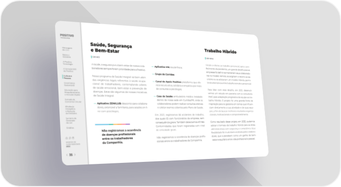 Saúde, Segurança Trabalho Híbrido Mensagem e Bem-Estar do CEO ▌ GRI 401-2 Sobre o ▌ GRI 403 Relatório Desde o retorno ao trabalho presencial, após o arre- A Positivo A saúde, a segurança e o bem-estar de nossos cola- ― Aplicativo VIK: saúde física; fecimento da pandemia, um grande desa昀椀o para as Tecnologia A Jornada ESG boradores sempre foram prioridade para a Positivo. empresas foi de昀椀nir se manteriam seus colaborado- da Positivo ― Grupo de Corridas; res no modelo remoto, se exigiriam o retorno ao es- Cultura e Nosso programa de Saúde Integral vai bem além critório ou se adotariam um modelo híbrido, permi- Pessoas das exigências legais referentes à saúde ocupa- ― Canal de Apoio Positivo: plataforma que ofe- tindo alternância entre trabalho remoto e presencial. Governança cional de trabalhadores, contemplando pilares rece escuta ativa, solidária e empática por meio Sustentável de saúde emocional, bem-estar e prevenção de de consultas a psicólogos; Para lidar com esse desa昀椀o, em 2021, desenvol- Educação para doenças. Estas são algumas de nossas iniciativas vemos um estudo em parceria com a consultoria Empoderamento e Inclusão Digital de Saúde Integral: ― Casa da Saúde: ambulatório médico instalado PWC para adaptação progressiva da equipe ao tra- Jornada da dentro de nossa sede em Curitiba/PR, onde os balho híbrido. O projeto foi uma grande fonte de Economia Circular ― Aplicativo ZENKLUB: desconto para colabora- colaboradores podem realizar consultas eletivas inspiração para os gestores em temas que in昀氀uen- E昀椀ciência dores, extensível a familiares, para sessões on-li- e coletar exames cobertos pelo Plano de Saúde. ciam diretamente a sua atividade e de suas equi- Energética e Redução ne com psicólogos; pes, a 昀椀m de buscar melhores resultados organiza- de Emissões Em 2022, registramos 66 acidentes de trabalho, cionais, motivacionais e comprometimento. Sumário de dos quais 65 com funcionários da empresa, sem Conteúdo da GRI consequência grave. Também detectamos 49 Não Como resultado desse projeto, em 2022, pudemos Créditos Conformidades que foram registradas com nível adotar o formato de trabalho híbrido para as áreas Não registramos a ocorrência de criticidade grave. administrativas com segurança e consistência. Essa de doenças pro昀椀ssionais 昀氀exibilidade foi muito bem recebida pelos colabora- entre os trabalhadores Não registramos a ocorrência de doenças pro昀椀s- dores, que a percebem como um ganho de bem- Relatório de da Companhia. sionais entre os trabalhadores da Companhia. -estar e equilíbrio entre vida pro昀椀ssional e pessoal. Sustentabilidade 2022 35