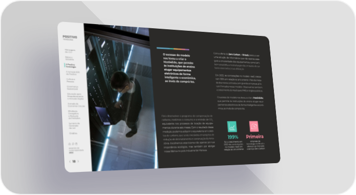 Com a oferta do Zero Carbon, o RHaaS passou a ser Mensagem O sucesso do modelo uma solução de informática que não apenas asse- do CEO nos levou a criar o gura a circularidade dos equipamentos, como tam- Sobre o HaaS4Edu, que permite bém possibilita a neutralização das emissões de car- Relatório às instituições de ensino bono associadas à sua utilização. A Positivo alugar equipamentos Tecnologia A Jornada ESG eletrônicos de forma Em 2022, as contratações no modelo HaaS cresce- da Positivo inteligente e econômica, ram 199% em relação ao ano anterior. Mais da meta- Cultura e ao invés de comprá-los. de dos novos contratos com grandes empresas já fo- Pessoas ram 昀椀rmados nesse modelo. Observamos também Governança o crescimento do HaaS para PMEs e órgãos públicos. Sustentável Educação para O sucesso do modelo nos levou a criar o HaaS4Edu, Empoderamento e Inclusão Digital que permite às instituições de ensino alugar equi- Jornada da pamentos eletrônicos de forma inteligente e econô- Economia Circular mica, ao invés de comprá-los. E昀椀ciência Energética e Redução Para desenvolver o programa de compensação de de Emissões carbono, medimos o consumo e a emissão de CO 2 Sumário de equivalente nos processos de locação de equipa- Conteúdo da GRI mentos durante seis meses. Com o resultado dessa Créditos medição, pudemos adquirir o equivalente em crédi- tos de carbono, que serão investidos em projetos de 199% Primeira redução de desmatamento e conservação da Ama- zônia. Escolhemos esse bioma não apenas por sua foi o crescimento em empresa de Relatório de importância ecológica, mas também por abrigar 2022 das contratações tecnologia no Brasil a Sustentabilidade no modelo HaaS em oferecer ao mercado 2022 nossa fábrica no polo industrial de Manaus. relação ao ano anterior o serviço Zero Carbon 18