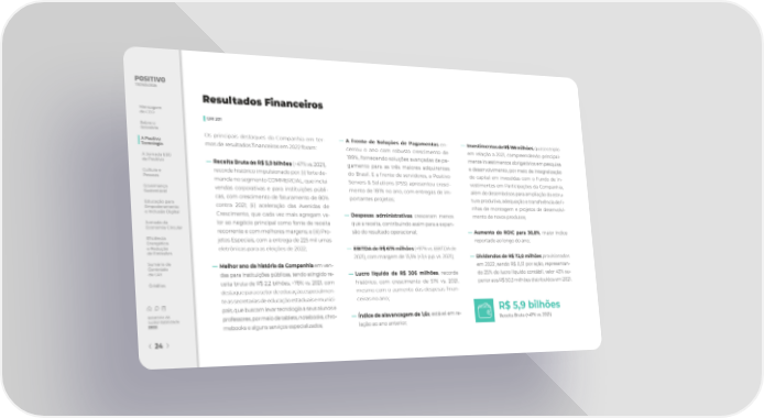 Resultados Financeiros Mensagem do CEO ▌ GRI 201 Sobre o Relatório Os principais destaques da Companhia em ter- ― A frente de Soluções de Pagamentos en- ― Investimentos de R$ 156 milhões, quase o triplo A Positivo mos de resultados 昀椀nanceiros em 2022 foram: cerrou o ano com robusto crescimento de em relação a 2021, compreendendo principal- Tecnologia A Jornada ESG 199%, fornecendo soluções avançadas de pa- mente investimentos obrigatórios em pesquisa da Positivo ― Receita Bruta de R$ 5,9 bilhões (+47% vs. 2021), gamento para as três maiores adquirentes e desenvolvimento, por meio de integralização Cultura e recorde histórico impulsionado por: (i) forte de- do Brasil. E a frente de servidores, a Positivo de capital em investidas com o Fundo de In- Pessoas manda no segmento COMMERCIAL, que inclui Servers & Solutions (PSS) apresentou cresci- vestimentos em Participações da Companhia, Governança vendas corporativas e para instituições públi- mento de 181% no ano, com entregas de im- além de desembolsos para ampliação da estru- Sustentável cas, com crescimento de faturamento de 80% portantes projetos; tura produtiva, adequação e transferência de li- Educação para contra 2021; (ii) aceleração das Avenidas de nhas de montagem e projetos de desenvolvi- Empoderamento e Inclusão Digital Crescimento, que cada vez mais agregam va- ― Despesas administrativas cresceram menos mento de novos produtos; Jornada da lor ao negócio principal como fonte de receita que a receita, contribuindo assim para a expan- Economia Circular recorrente e com melhores margens; e (iii) Pro- são do resultado operacional; ― Aumento do ROIC para 30,8%, maior índice E昀椀ciência jetos Especiais, com a entrega de 225 mil urnas reportado ao longo do ano; Energética e Redução eletrônicas para as eleições de 2022; ― EBITDA de R$ 675 milhões (+97% vs. EBITDA de de Emissões 2021), com margem de 13,5% (+3,4 p.p. vs. 2021); ― Dividendos de R$ 72,0 milhões provisionados Sumário de ― Melhor ano da história da Companhia em ven- em 2022, sendo R$ 0,51 por ação, representan- Conteúdo da GRI das para instituições públicas, tendo atingido re- ― Lucro líquido de R$ 306 milhões, recorde do 25% do lucro líquido contábil, valor 43% su- Créditos ceita bruta de R$ 2,2 bilhões, +76% vs. 2021, com histórico, com crescimento de 51% vs. 2021, perior aos R$ 50,3 milhões distribuídos em 2021. destaque para o setor de educação, especialmen- mesmo com o aumento das despesas 昀椀nan- te as secretarias de educação estaduais e munici- ceiras no ano; pais, que buscam levar tecnologia a seus alunos e R$ 5,9 bilhões Relatório de professores, por meio de tablets, notebooks, chro- ― Índice de alavancagem de 1,6x, estável em re- Sustentabilidade Receita Bruta (+47% vs. 2021) 2022 mebooks e alguns serviços especializados; lação ao ano anterior; 24