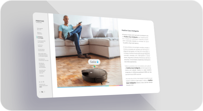 Positivo Casa Inteligente Mensagem do CEO A Positivo investe continuamente na plataforma de Sobre o IoT Positivo Casa Inteligente, que hospeda produ- Relatório tos e soluções de automação e segurança residen- A Positivo ciais conectadas, baseada no conceito DYI (Do it Tecnologia A Jornada ESG Yourself ou Faça Você Mesmo). da Positivo Cultura e A marca oferece uma solução completa, simples e Pessoas intuitiva, composta por produtos de Iluminação In- Governança teligente (lâmpadas wi-昀椀, 昀椀tas LED conectadas, lu- Sustentável minárias), Conforto e Automação (plugs inteligentes, Educação para controles universais wi-昀椀, interruptores e aciona- Empoderamento e Inclusão Digital dores), Segurança (câmeras, fechaduras, alarmes e Jornada da sensores), Conectividade (roteadores) e Eletroportá- Economia Circular teis (robôs aspiradores). E昀椀ciência Energética e Redução Todos os produtos são comandados pelo aplicati- de Emissões vo Positivo Casa Inteligente, primeiro app do seg- Sumário de mento com adoção massiva no varejo brasileiro Conteúdo da GRI (mais de um milhão de usuários em 2023) com de- Créditos senvolvimento 100% nacional. Por meio do acesso a tecnologias inovadoras, que trazem conforto e bem-estar à rotina, a Positivo Relatório de - Sustentabilidade Casa Inteligente oferece a seus clientes liberda 2022 de para viver. 14