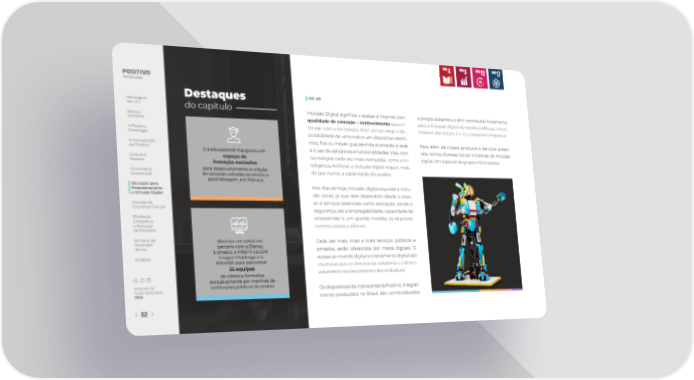 Destaques ▌ GRI 413 Mensagem do CEO do capítulo Inclusão Digital signi昀椀ca o acesso à Internet com a preços acessíveis, e têm contribuído fortemente Sobre o qualidade de conexão e conhecimento para in- para a inclusão digital de escolas públicas, consu- Relatório teragir com a tecnologia. Esse acesso exige a dis- midores das classes C e D, e pequenas empresas. A Positivo ponibilidade de uma rede e um dispositivo eletrô- Tecnologia A Jornada ESG nico, 昀椀xo ou móvel, que permita a conexão à rede Para além de nossos produtos e serviços acessí- da Positivo O e.educacional inaugurou um e o uso de aplicativos e funcionalidades. Mas, com veis, temos diversas outras iniciativas de inclusão Cultura e espaço de tecnologias cada vez mais avançadas, como a In- digital, em especial de grupos minorizados. Pessoas inovação exclusivo teligência Arti昀椀cial, a inclusão digital requer, mais Governança para desenvolvimento e criação do que nunca, a capacitação do usuário. Sustentável de soluções voltadas ao ensino e aprendizagem, em Manaus. Educação para Nos dias de hoje, inclusão digital equivale à inclu- Empoderamento e Inclusão Digital são social, já que dela dependem desde o aces- Jornada da so a serviços essenciais como educação, saúde e Economia Circular segurança, até a empregabilidade, capacidade de E昀椀ciência empreender e, em grande medida, os relaciona- Energética e Redução mentos sociais e afetivos. de Emissões Sumário de Abrimos um edital em Cada vez mais, mais e mais serviços, públicos e Conteúdo parceria com a Disney, da GRI a Unesco, a FIRST® LEGO® privados, serão oferecidos por meios digitais. O Créditos League Challenge e o acesso ao mundo digital e o letramento digital são micro:bit para patrocinar essenciais para o exercício da cidadania e o desen- 25 equipes volvimento socioeconômico dos indivíduos. de robótica formadas exclusivamente por meninas de Relatório de instituições públicas de ensino. Os dispositivos da marca própria Positivo, integral- Sustentabilidade 2022 mente produzidos no Brasil, são comercializados 52