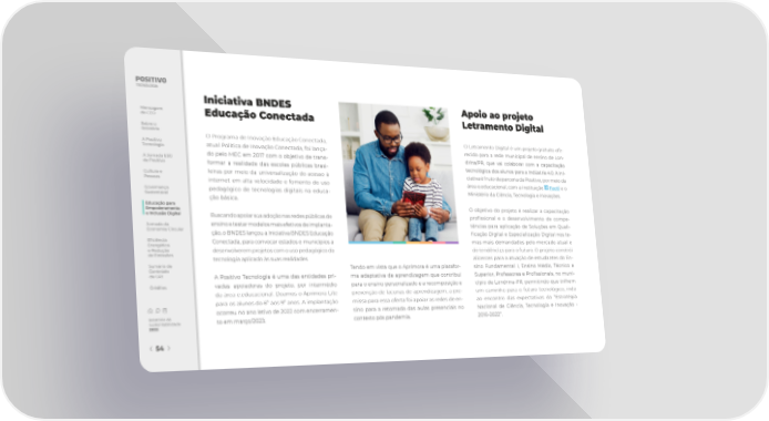 Iniciativa BNDES Apoio ao projeto Mensagem Educação Conectada Letramento Digital do CEO Sobre o Relatório O Programa de Inovação Educação Conectada, O Letramento Digital é um projeto gratuito ofe- A Positivo atual Política de Inovação Conectada, foi lança- recido para a rede municipal de ensino de Lon- Tecnologia A Jornada ESG do pelo MEC em 2017 com o objetivo de trans- drina/PR, que vai colaborar com a capacitação da Positivo formar a realidade das escolas públicas brasi- tecnológica dos alunos para a Indústria 4.0. A ini- Cultura e leiras por meio da universalização do acesso à ciativa é fruto da parceria da Positivo, por meio da Pessoas internet em alta velocidade e fomento do uso área e.educacional, com a instituição Facti e o Governança pedagógico de tecnologias digitais na educa- Ministério da Ciência, Tecnologia e Inovações. Sustentável ção básica. Educação para O objetivo do projeto é realizar a capacitação Empoderamento e Inclusão Digital Buscando apoiar sua adoção nas redes públicas de profissional e o desenvolvimento de compe- Jornada da ensino e testar modelos mais efetivos de implanta- tências para aplicação de Soluções em Quali- Economia Circular ção, o BNDES lançou a Iniciativa BNDES Educação ficação Digital e Especialização Digital nos te- E昀椀ciência Conectada, para convocar estados e municípios a mas mais demandados pelo mercado atual e Energética e Redução desenvolverem projetos com o uso pedagógico da de tendências para o futuro. O projeto constrói de Emissões tecnologia aplicado às suas realidades. alicerces para a atuação de estudantes do En- Sumário de Tendo em vista que o Aprimora é uma platafor- sino Fundamental I, Ensino Médio, Técnico e Conteúdo da GRI A Positivo Tecnologia é uma das entidades pri- ma adaptativa de aprendizagem que contribui Superior, Professores e Profissionais, no muni- Créditos vadas apoiadoras do projeto, por intermédio para o ensino personalizado e a recomposição e cípio de Londrina-PR, permitindo que trilhem da área e.educacional. Doamos o Aprimora Lite prevenção de lacunas de aprendizagem, a pre- um caminho para o futuro tecnológico, indo para os alunos do 6º aos 9º anos. A implantação missa para essa oferta foi apoiar as redes de en- ao encontro das expectativas da “Estratégia ocorreu no ano letivo de 2022 com encerramen- sino para a retomada das aulas presenciais no Nacional de Ciência, Tecnologia e Inovação - Relatório de to em março/2023. contexto pós pandemia. 2016-2022”. Sustentabilidade 2022 54